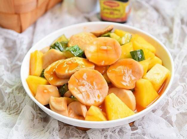 ?菠蘿切塊,用鹽水浸泡一會兒后瀝干水分備用。 ?起鍋熱油,爆香姜末,倒入雞腿菇炒至顏色變金黃,倒入生抽調味。 ?倒入調好的糖醋汁和番茄醬拌勻,讓雞腿菇吸收醬汁。 ?放入青瓜塊和菠蘿塊,翻炒均勻即可盛盤。