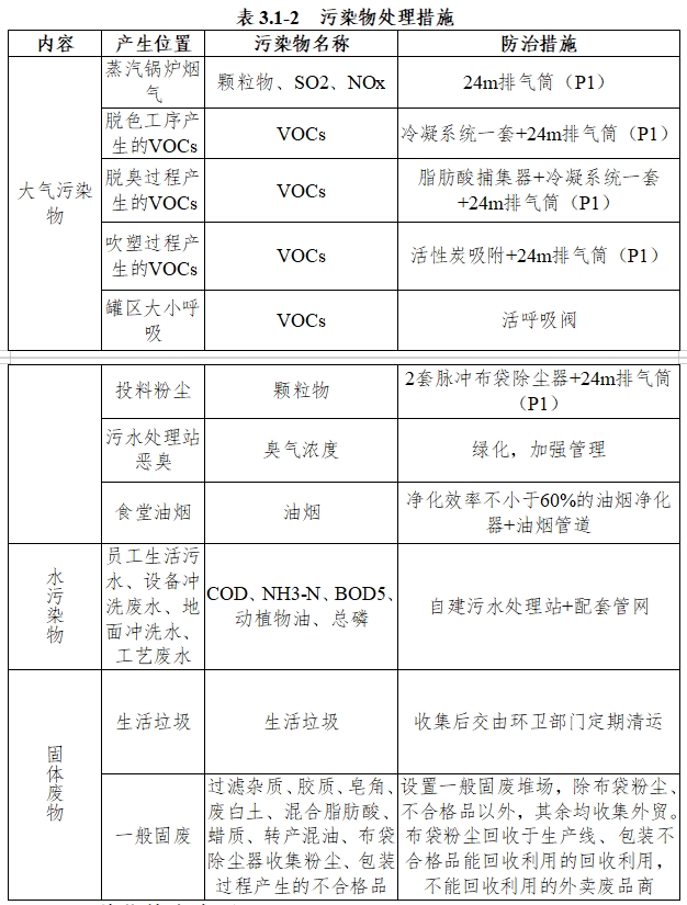 公司生產過程中產生項目過濾雜質、膠質、皂角、廢白土、混合脂肪酸、蠟質、轉產混油等一般固廢均外賣處理。布袋除塵器收集的粉塵全部回用。包裝過程產生的不合格品盡可能的回用,不能回用的外賣度品回收商。項目產生的吹塑度氣經活性炭吸附后外排,為危險度物。廢物類別為度有機溶劑和含有機溶劑度物,定期交由湖南江環保科技有限公司進行處置。生活垃圾交由環衛部門處理。