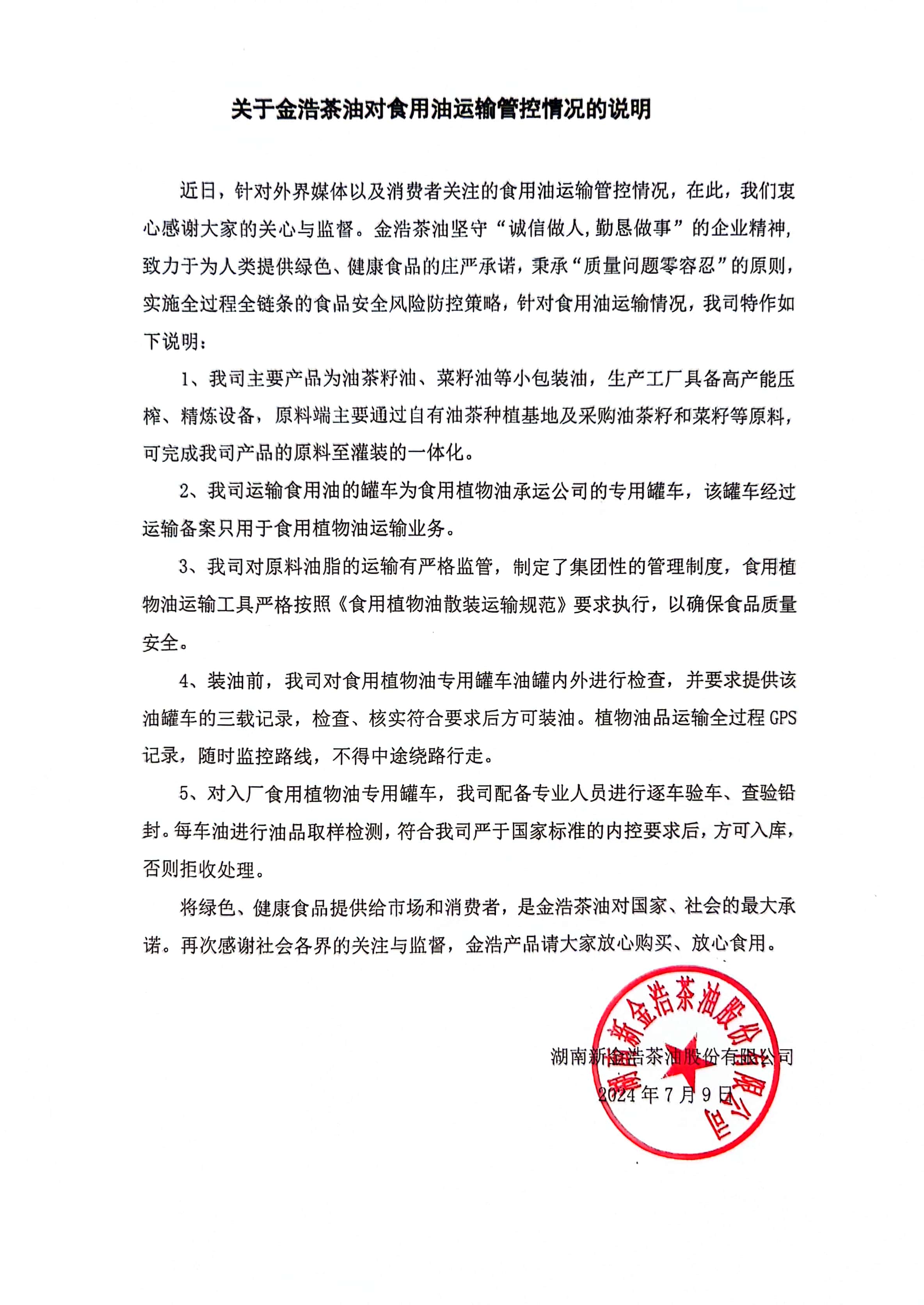 關于金浩茶油對食用油運輸管控情況的說明